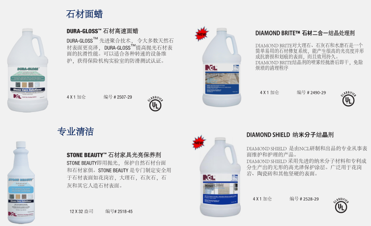NCL的石材护理系统™对天然石材和陶瓷表面光泽的保持维护和修复是一个完整的、专业的系统。这种协调的系统在保持和修复天然石材地面,台面保持高光泽度的同时防止表面的污渍侵蚀。50多年来NCL 生产了卫生维护专业人士信任的高质量以及高性能的产品。在NCL,我们所有的创新的产品和杰出表现的系统设计的发展方向是节省您的时间,劳动强度和费用。石材护理系统™为您提供任何天然石材或瓷砖表面高性能安全,专用维护产品。这个全面的计划是专为建筑服务承包商和内部设施服务提供商设计,并不需要多年的技术经验与研磨方法!